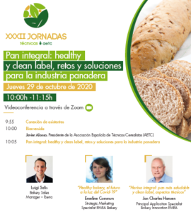 Tras el éxito del programa especial de las XXXII Jornadas Técnicas de la AETC, desarrollado los pasados 19, 20 y 21 de octubre, la asociación ha organizado la jornada online «Pan integral: healthy y clean label, retos y soluciones para la industria panadera», que ha contado con más de 100 asistentes y en la que se han analizado los retos técnicos para la producción de panes integrales saludables a través de soluciones convencionales y clean label